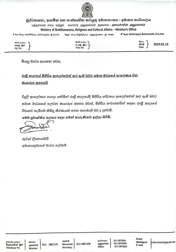 The statement further noted that an image of an illuminated Sigiriya rock during night time, which has been making rounds on social media, is also fake.